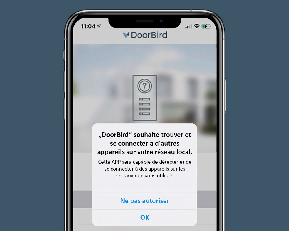 En raison des nouveaux paramètres de confidentialité de l’iOS 14, une fenêtre pop-up s’ouvre automatiquement  dans l’application DoorBird. Pour permettre à l’application de communiquer avec d’autres appareils DoorBird dans votre réseau local, veuillez confirmer la notification par “OK” ou modifier cette option à tout moment dans les paramètres de votre iOS (paramètres iOS → faire défiler vers le bas → DoorBird → activer le curseur “réseau local”). Voir aussi notre FAQ.
